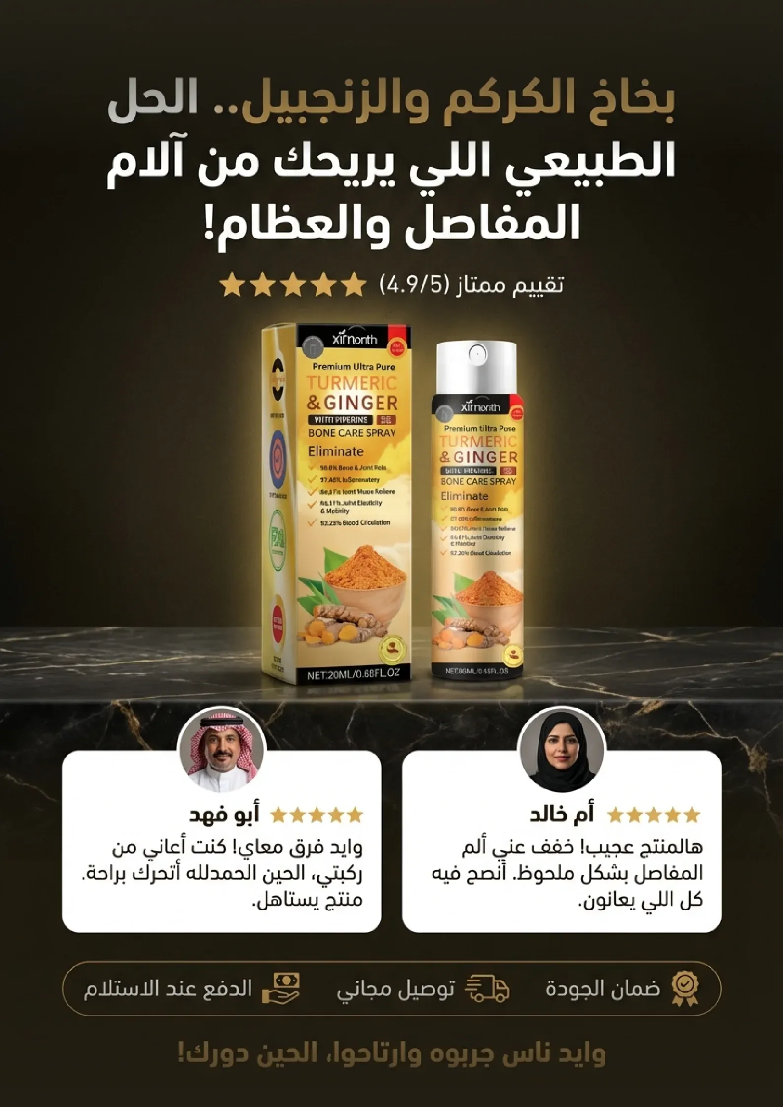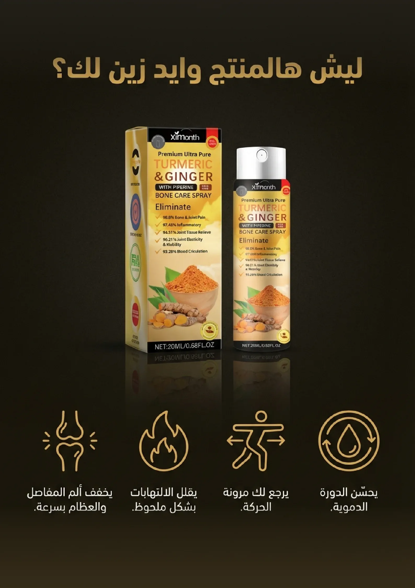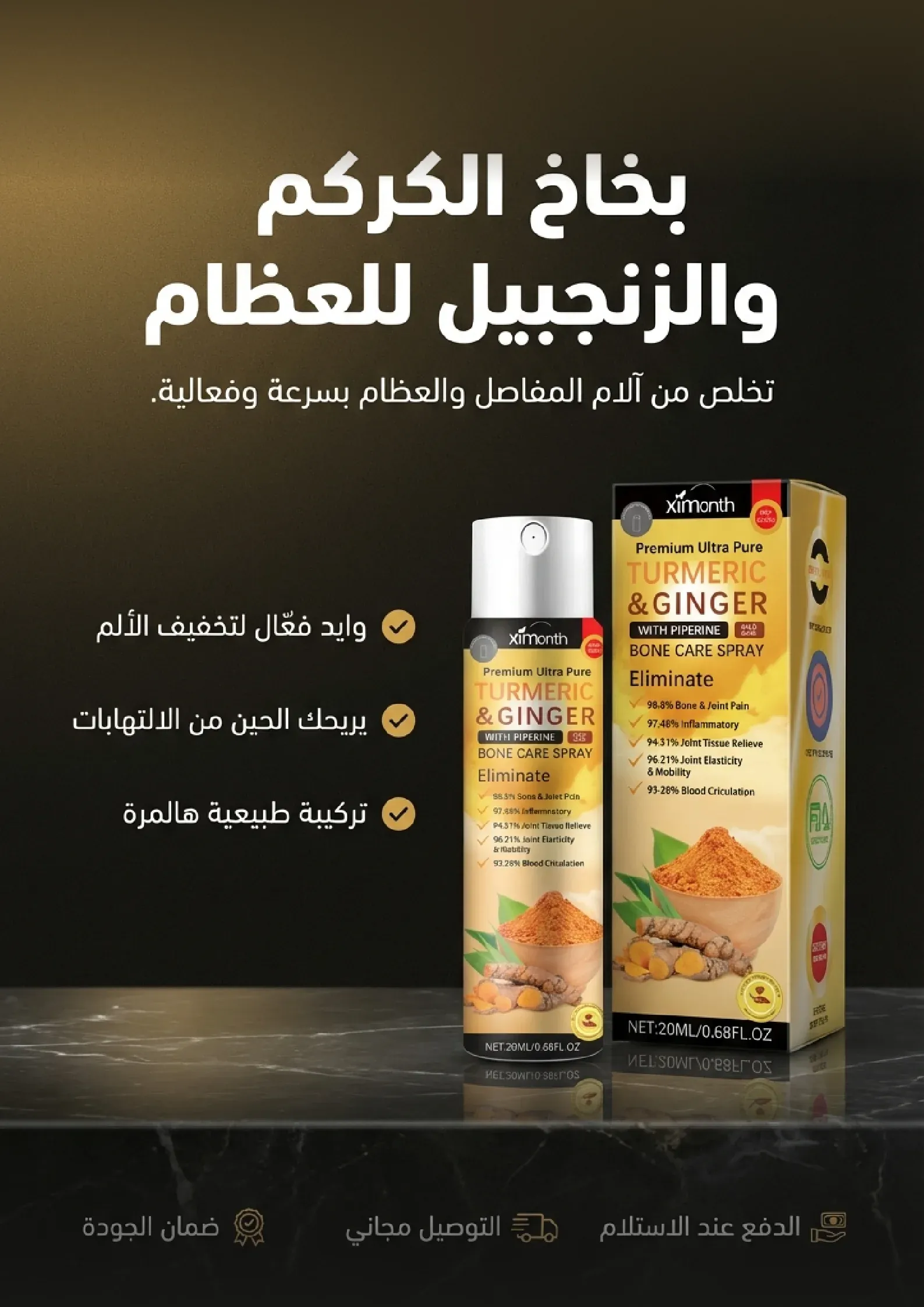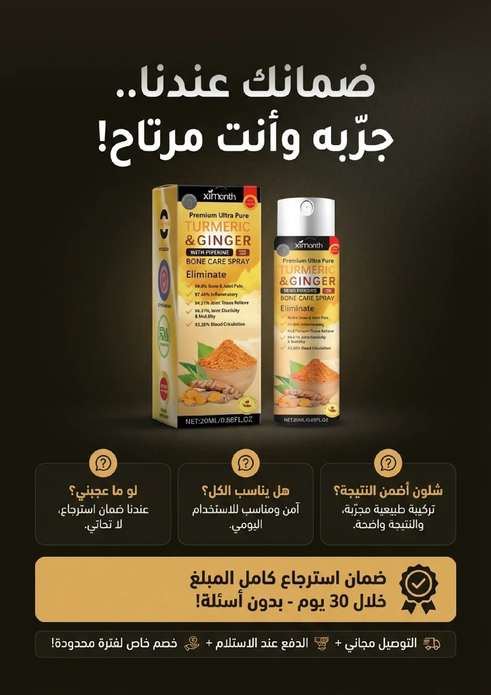استعيدوا حيويتكم وانطلقوا نحو حياة مليئة بالنشاط. بخاخ الكركم والزنجبيل الطبيعي هو الحل الأمثل لتخفيف آلام المفاصل والعضلات. استمتعوا بحرية الحركة والراحة التي تستحقونها. لا تدعوا الألم يحد من طموحاتكم، اغتنموا الفرصة الآن!